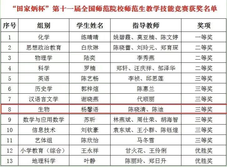 此次获奖,充分展现了我院学子扎实的专业基础和良好的教学风貌,也体现了学院在师范生培养方面的阶段性成效。学院将继续秉持“以赛促学、以学促用”的理念,着力提升学生的专业素养与教学实践能力,持续推动生物科学(师范)专业人才培养质量不断提升。