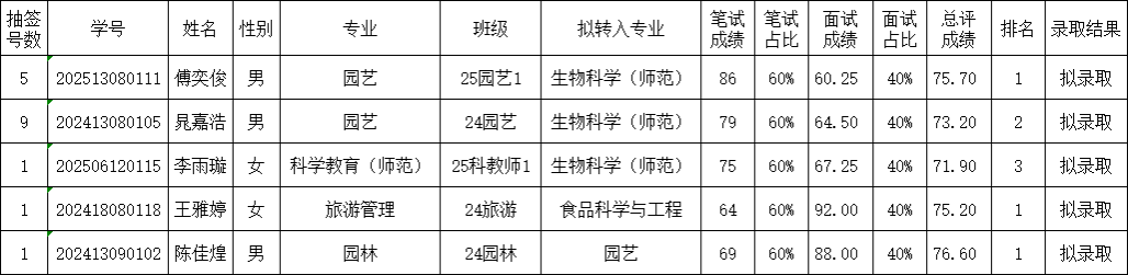 根据《闽南师范大学普通本科生转专业管理办法》(闽南师大〔2022〕60号)及生物科学与技术学院转专业工作方案(2025-2026学年)文件,坚持学生自愿申请、学生和专业双向选择,在公平、公正、公开的基础上,对学生专业基础知识、综合能力等方面进行综合考核,经学院教学指导委员会及学院党政联席会议审议通过,现将拟转入名单公示如下: