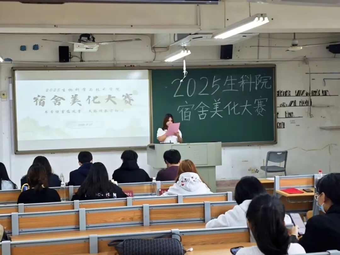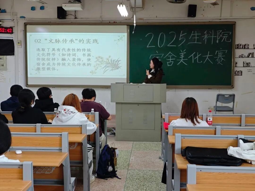 自大赛启动以来,生科院学子踊跃参与,各宿舍巧思迸发,打造出一个个墨香氤氲、雅致有序的宿舍小天地。决赛现场,各宿舍派出代表,以PPT为载体,围绕“文明素养、装扮设计、空间利用、总结与期望”逐一讲解宿舍风貌:古籍陈列的书架、笔墨点缀的墙面、诗词装饰的角落,每一处用心的布置、巧妙的规划,既让宿舍焕发青春活力,更将文脉传承的理念融入日常方寸之间。